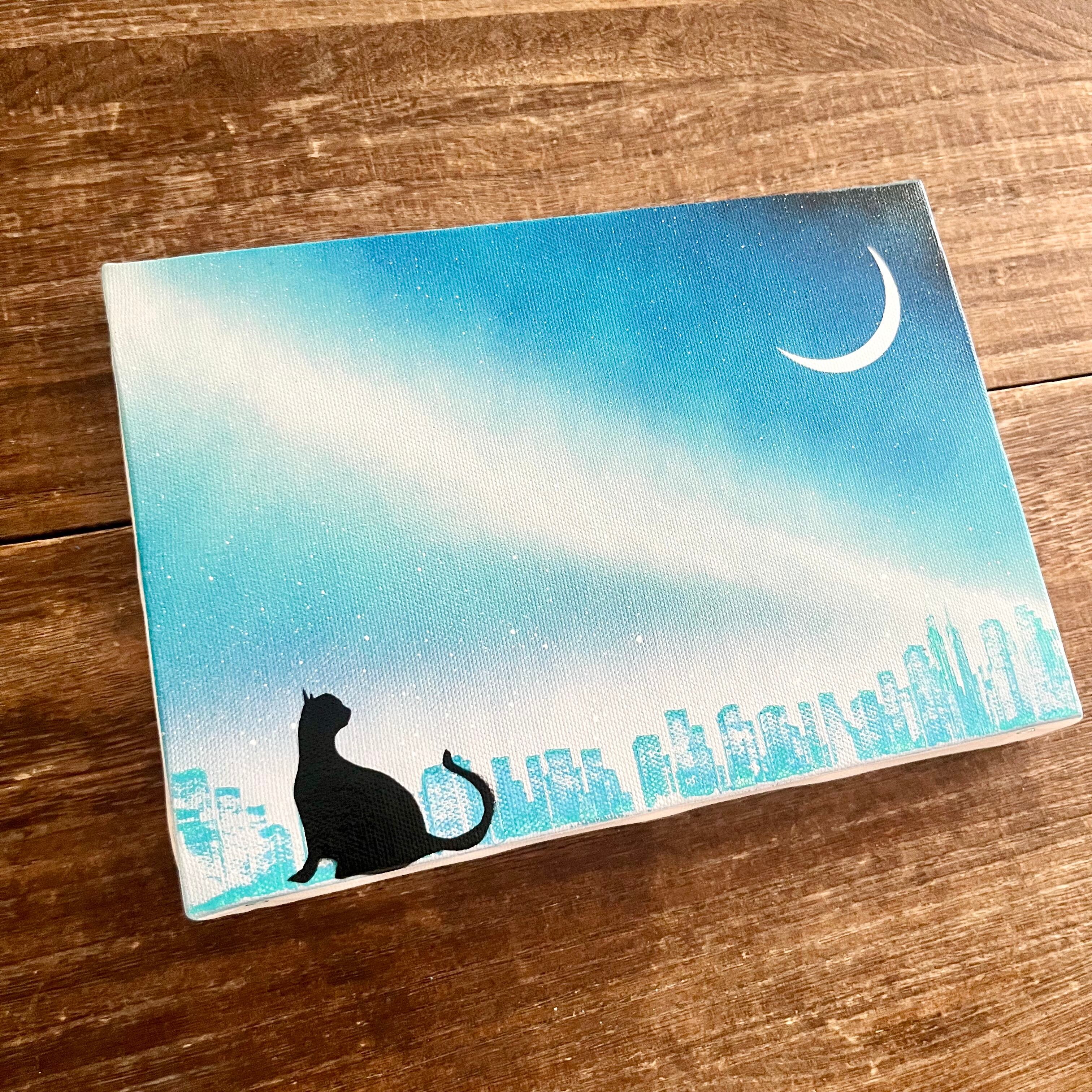 「三日月と猫」原画 月夜×星空×黒猫 青 ターコイズ 絵画 キャンバス 風景画 スプレーアート インテリアパネル