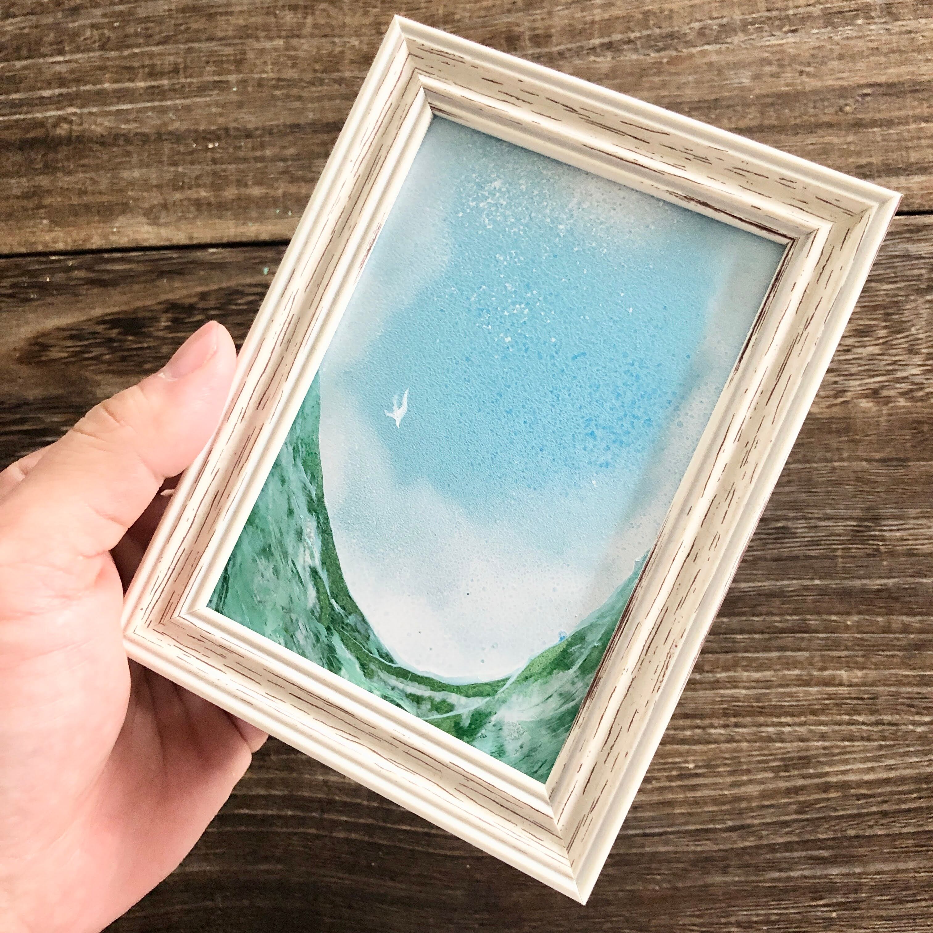 スタンド付きミニ原画 「見上げた空」 青空×鳥×風景 ちょっとしたスペースに飾るスプレーアート