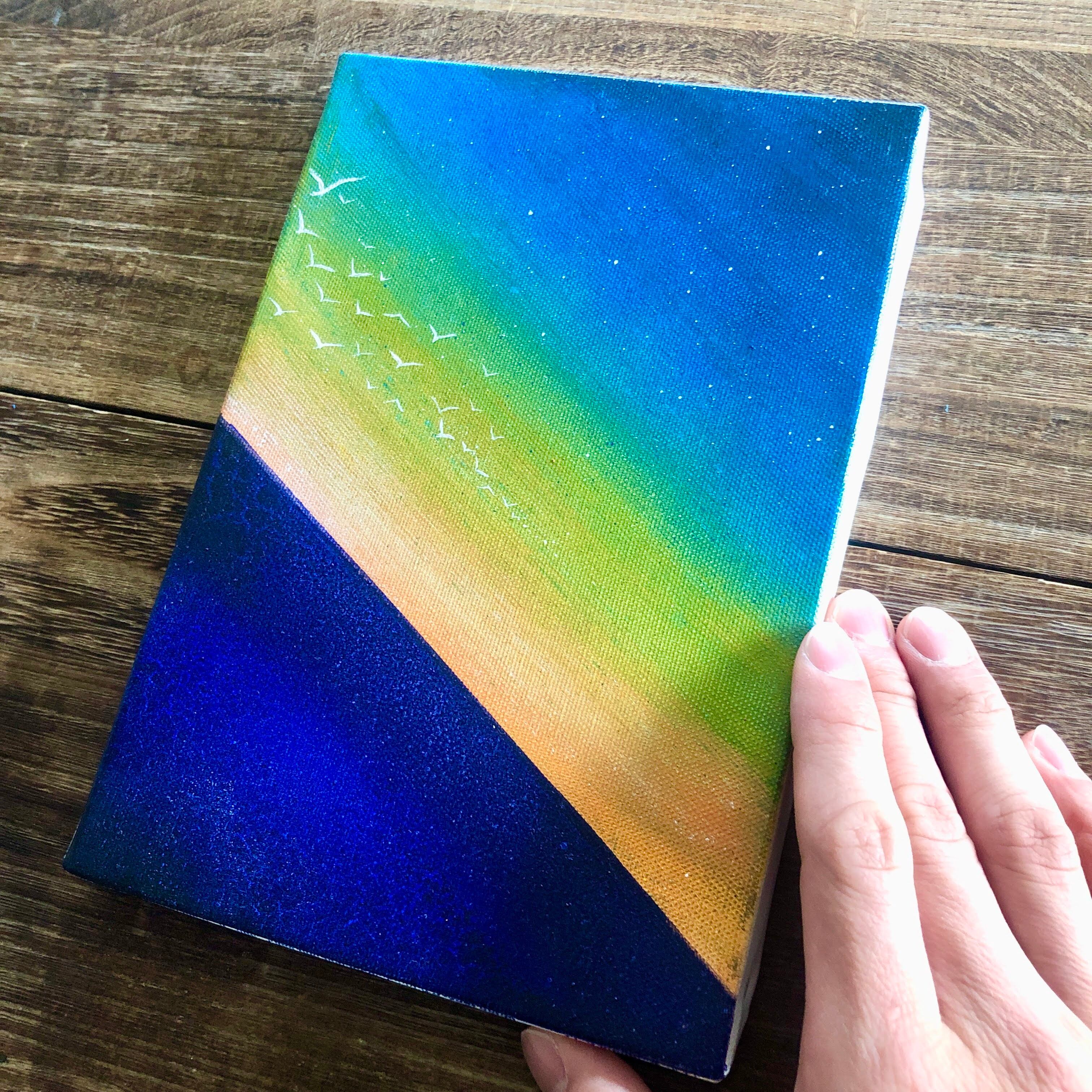 「Border」原画 空×海×渡り鳥 青 オレンジ マリンブルー 絵画 キャンバス 風景画 スプレーアート インテリアパネル