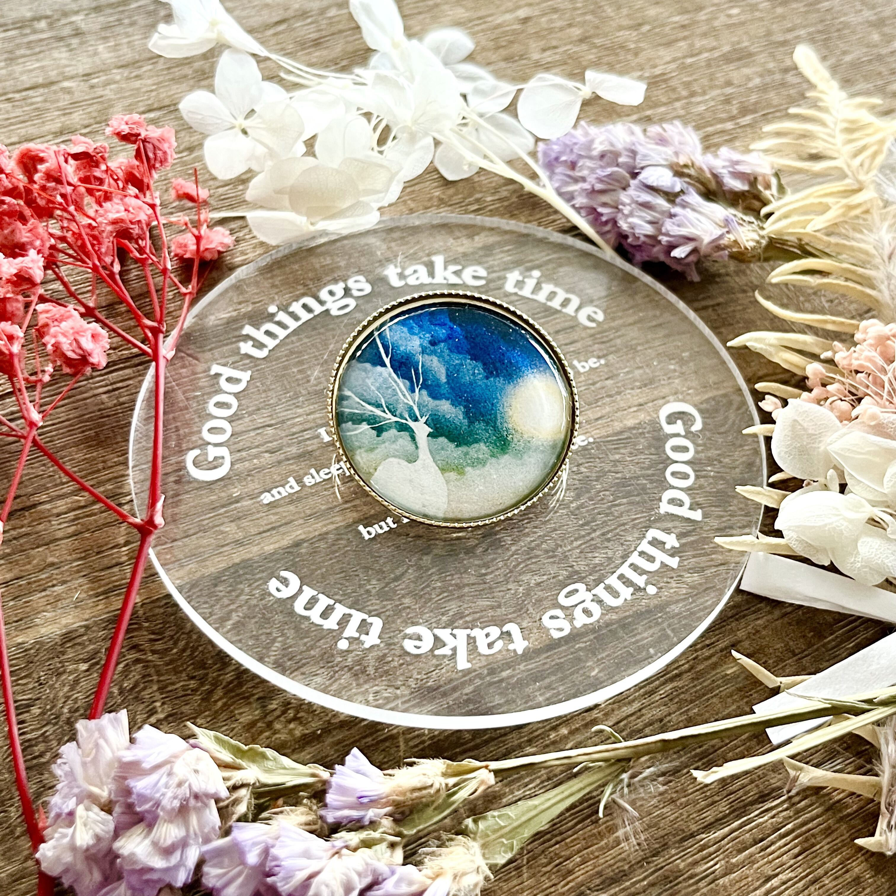 お出かけがちょっと楽しくなる、日常でカジュアルに使える風景画のブローチです。