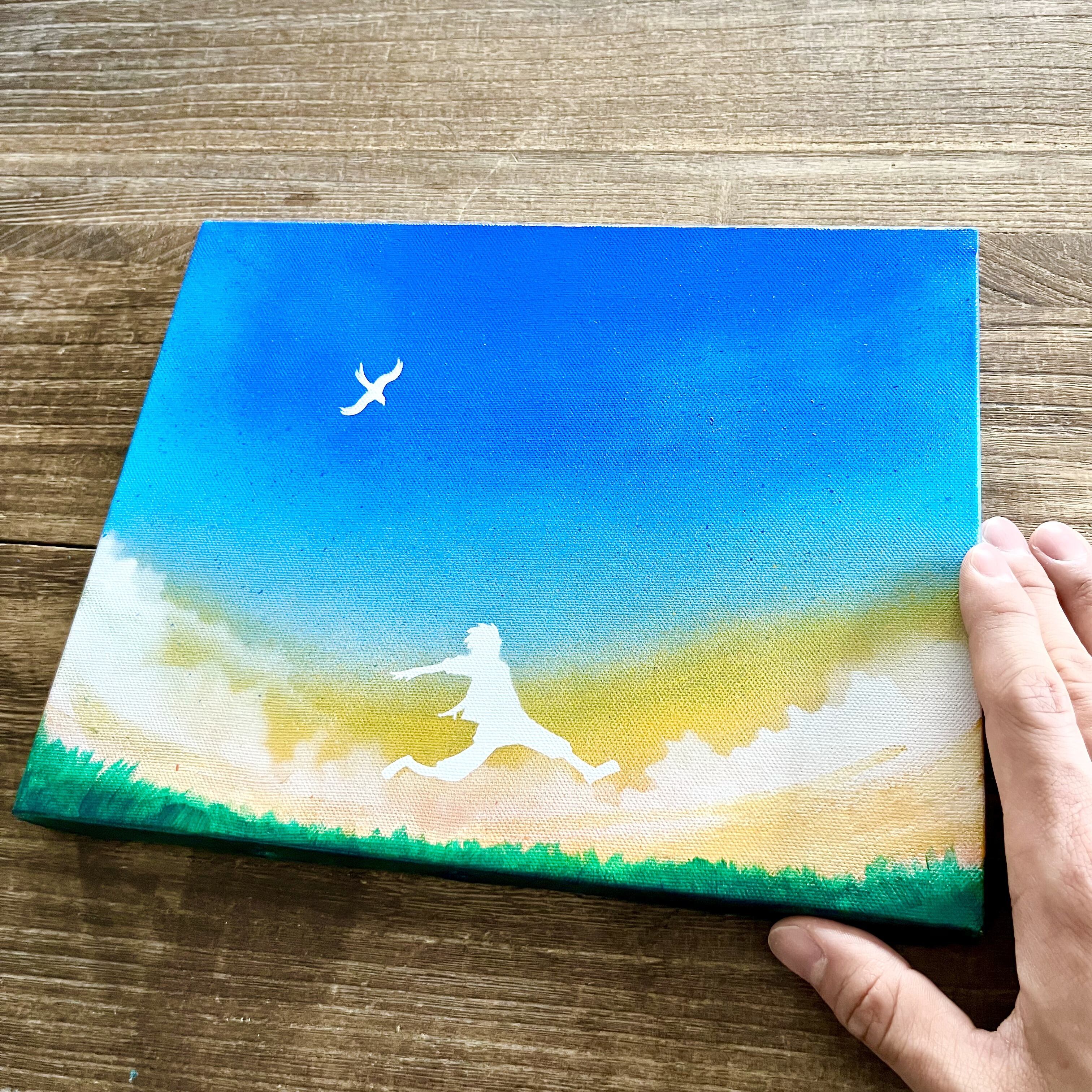 「あの空まで飛べたら」 原画 空×鳥×少年 青 絵画 キャンバス 風景画 スプレーアート インテリアパネル